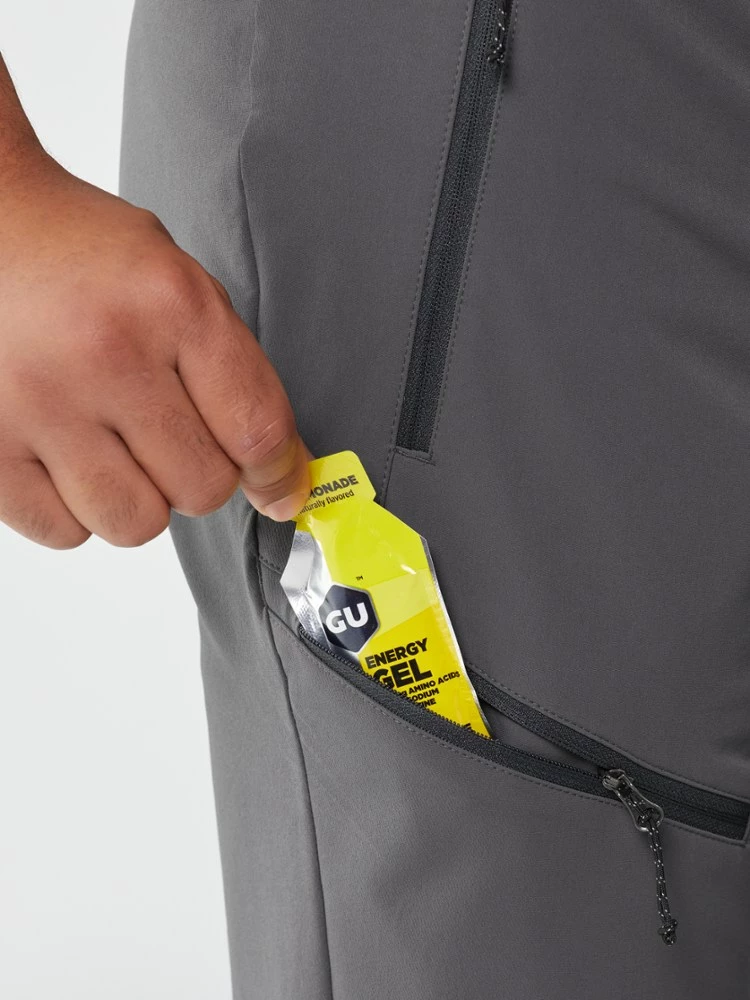 - Zip hand pockets, zip thigh pocket and back pockets with hook-and-loop closure hold your trail essentials secure