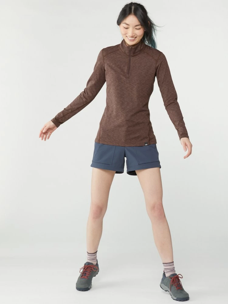 An ideal first layer for playing hard on cold days, the women’s REI Co-op Midweight Base Layer half-zip top offers the warmth of long sleeves and easy venting thanks to a front zipper.