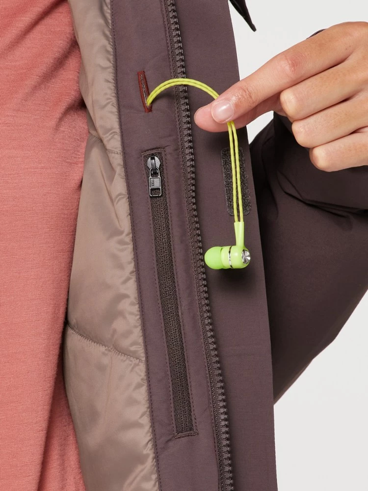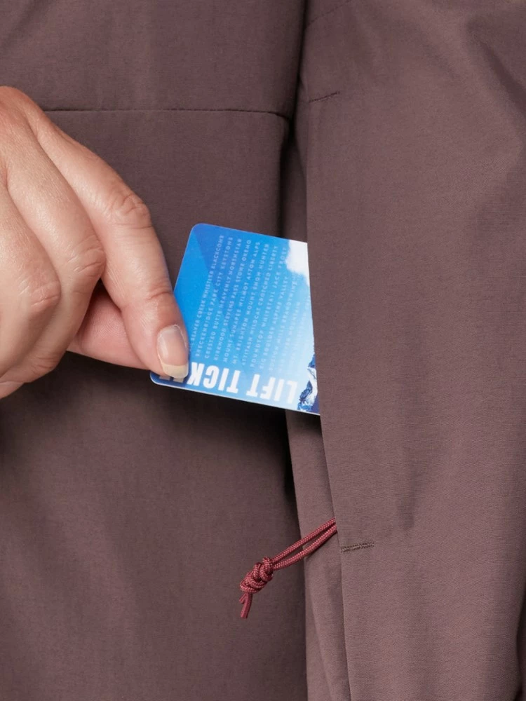 - Media port and plenty of pockets, including a lift pass pocket on wearer’s left wrist, a key clip in the left hand pocket and drop-in goggle pocket inside the wearer’s right