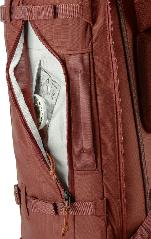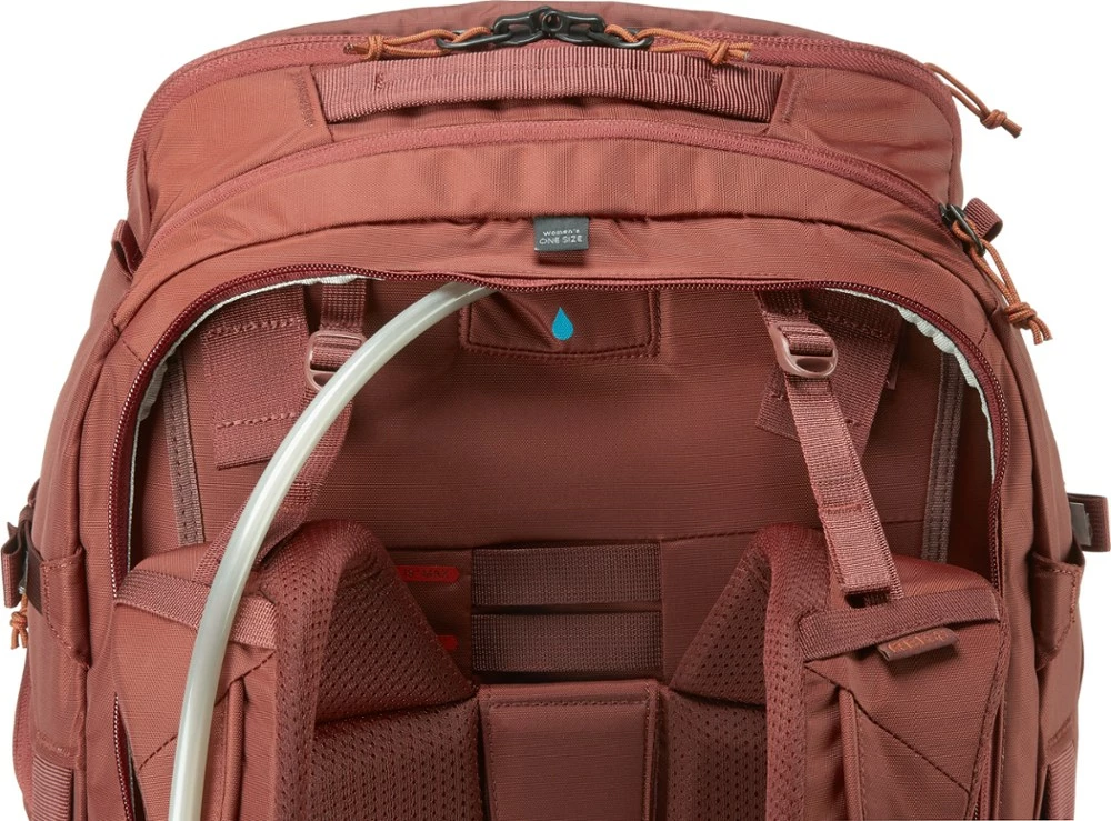 - Access port on the left side of the pack accommodates a hydration reservoir tube (reservoir not included)