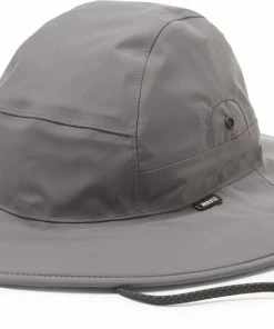 - Brim is longer in back for neck coverage; one side of crown folds up and snaps in place