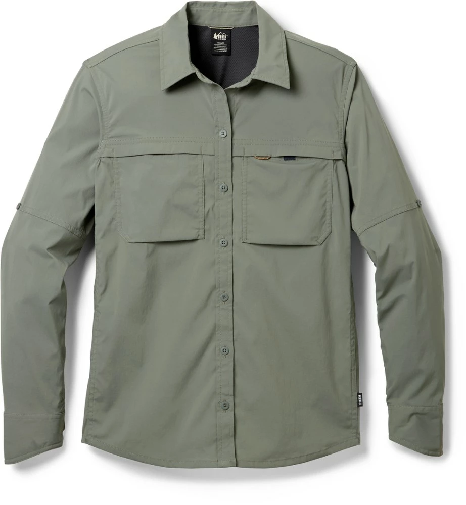 Beloved by thru-hikers and day hikers alike for its cool comfort and adjustable coverage, the women’s solid REI Co-op Sahara shirt travels well, too— it packs small and dries fast.