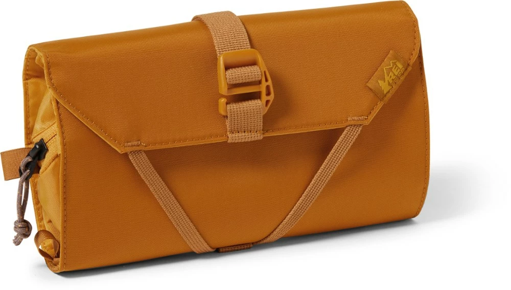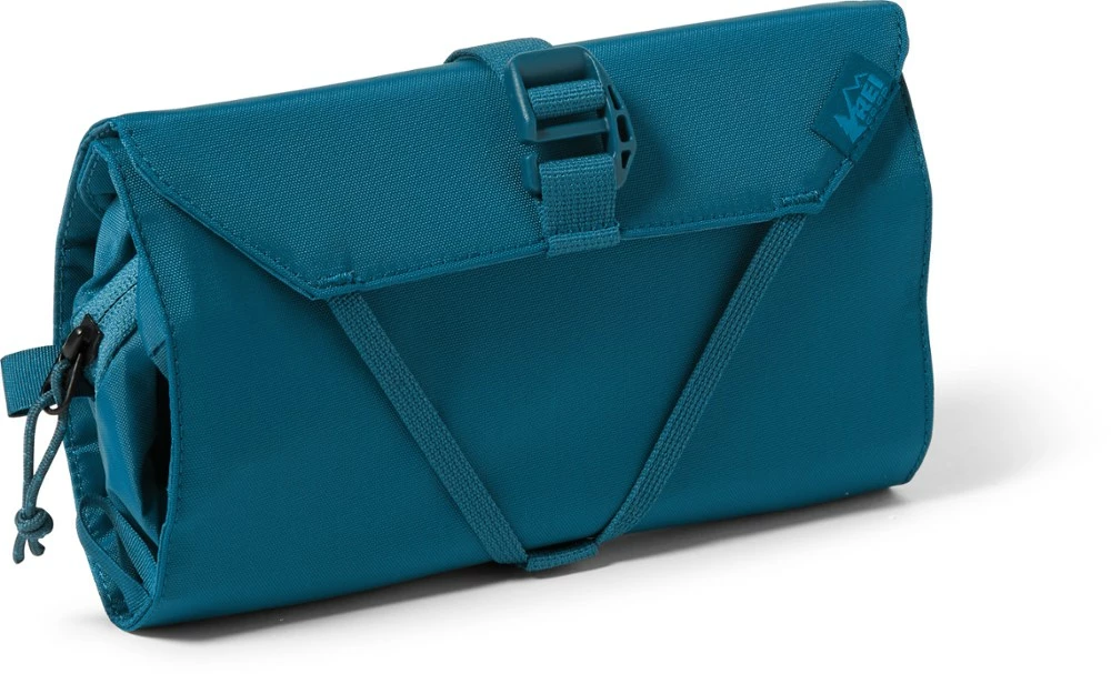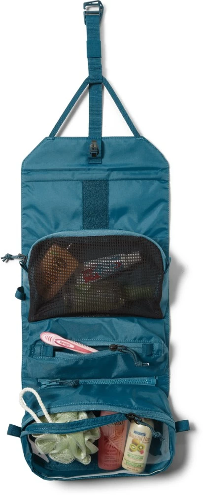 Hang the REI Co-op small Shower Roll from a hook (or tree branch) when you get to your destination. It rolls up small and holds plenty of toiletries in 3 different types of pockets.