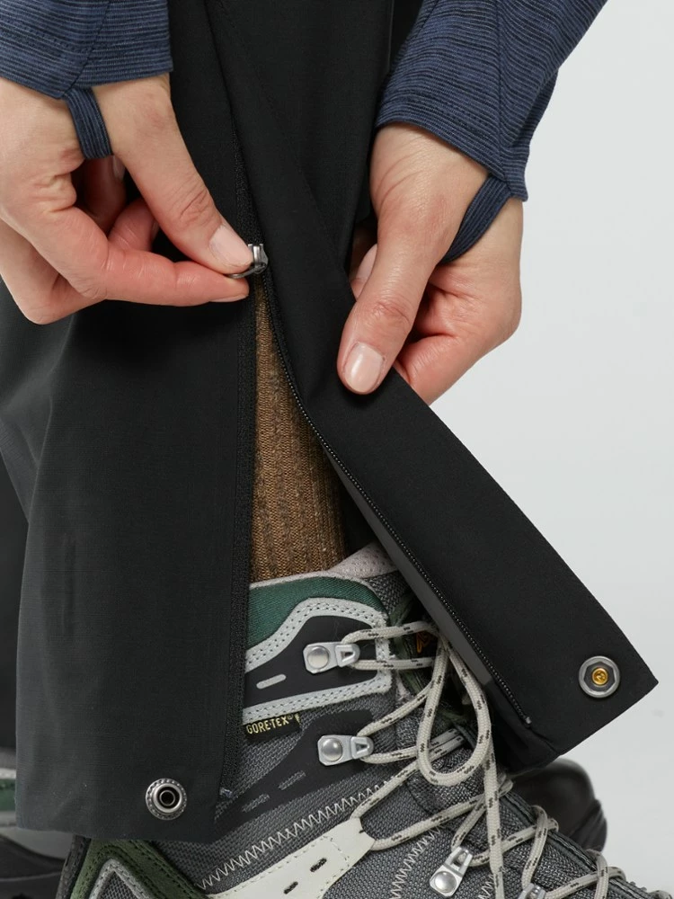 - Ankle zips with snaps allow easy on and off, while also improving the fit over boots